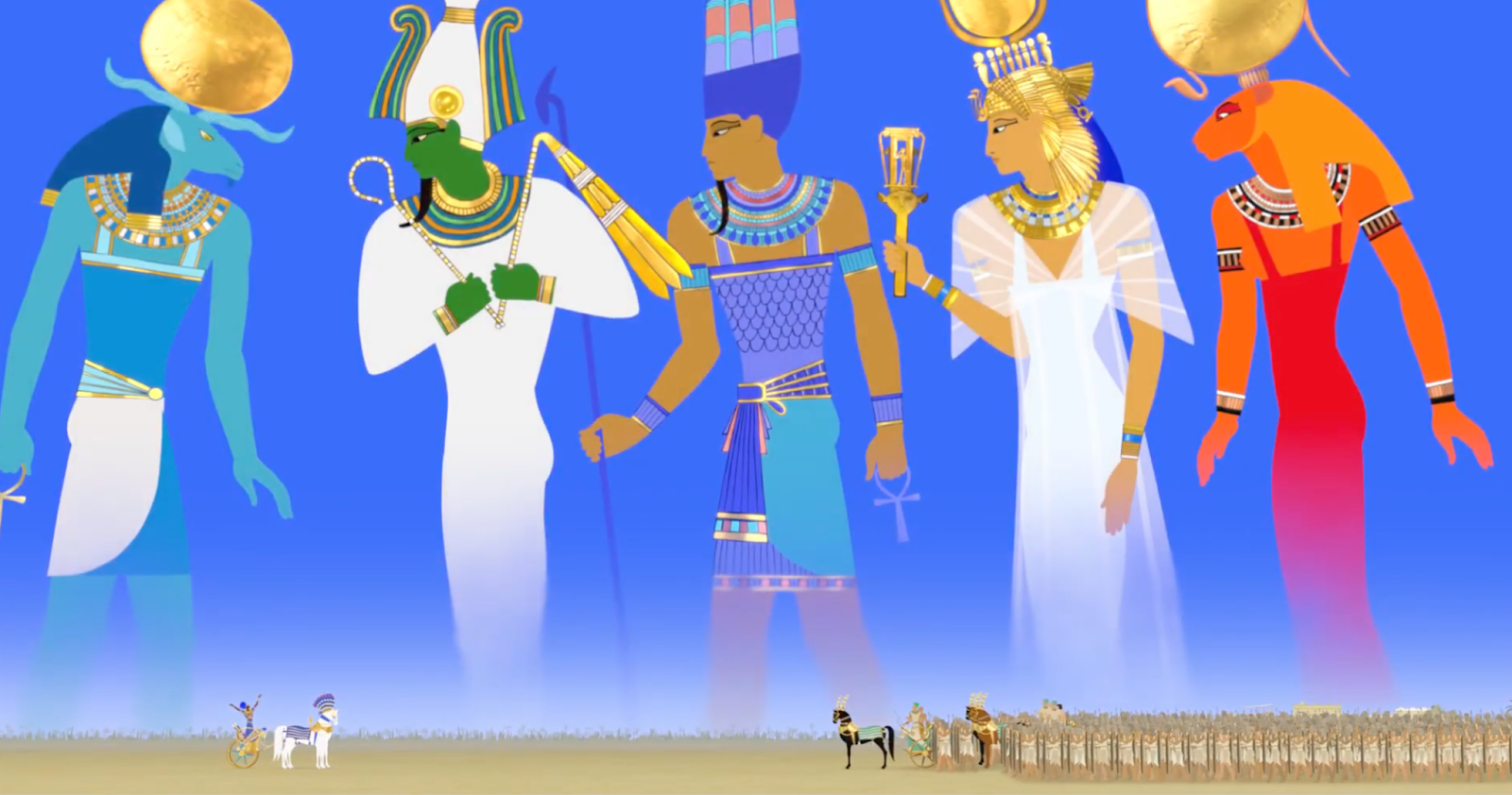 Dans une séquence du film d’animation Le Pharaon, le Sauvage et la Princesse, le réalisateur Michel Ocelot nous entraîne au cœur d’un imaginaire inspiré de l’Égypte antique. L’image évoque immédiatement les grandes civilisations du Nil : temples monumentaux, figures royales et présence constante du sacré. Le style graphique, très épuré, s’appuie sur des couleurs lumineuses et des formes stylisées qui rappellent les fresques et les motifs décoratifs égyptiens Les silhouettes, souvent de profil, adoptent une composition hiératique qui évoque l’esthétique des bas-reliefs antiques.